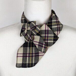 Introducing our exquisite women's cream, black, plum and yellow wool (not the itchy kind) Tartan Ascot – a true statement piece in upcycled fashion. Hand-stitched with precision and crafted from carefully selected neckties, this one-of-a-kind accessory is a statement piece for women who demand attention and adore standing out. Elevate your style with this unique ascot, perfect for the confident woman with an eye for the extraordinary!