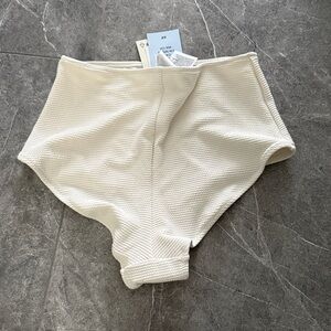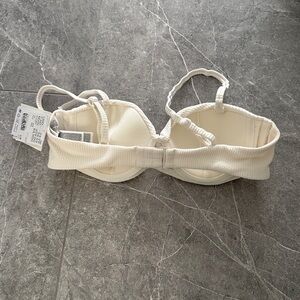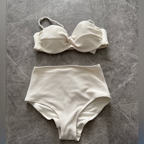 Two-piece cream textured bikini. Removable straps on top with twist detail. High-waist textured bottoms. Soft ribbed fabric and minimalist design.