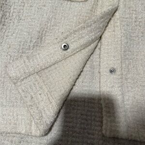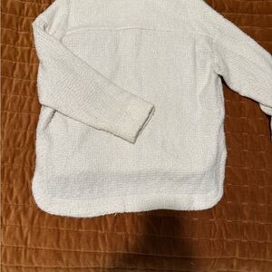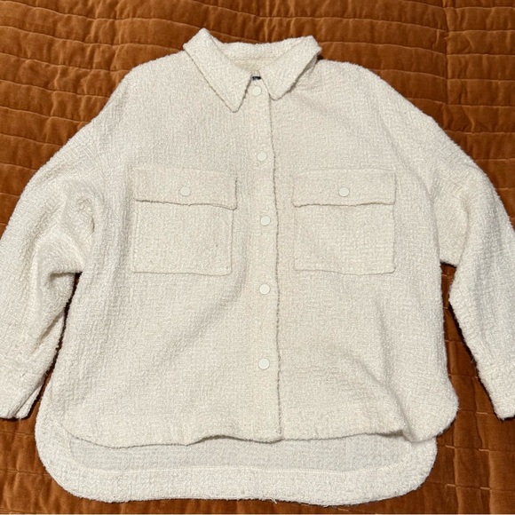 Stylish white button-up shacket with a textured design. Features two front pockets and a classic collar. Lightly used. No stains, slight pilling in fabric on sleeves