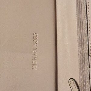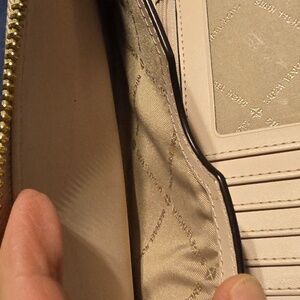 Elegant cream/ pink. wallet Features textured surface and gold logo. Stylish and functional.