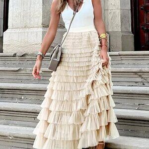 Cream Tiered Tulle Dreamy Maxi Skirt Free Size Elegant A-Line Ankle Length NWOT