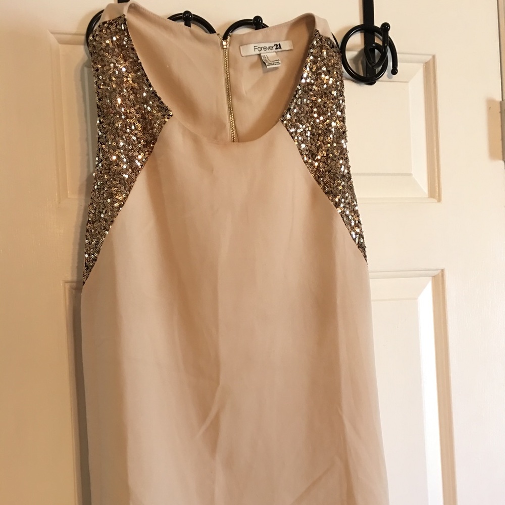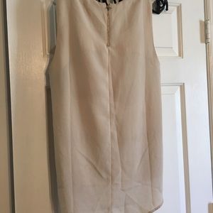 Cream top, a little longer in the back than the front, golden sparkles on the sides of the sleeves, tank top style. Zipper in the back.