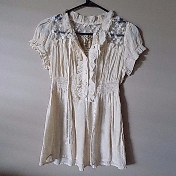 Cream top with elastic cinching in middle. Ruffles and button detail in front and lace detail on shoulders.