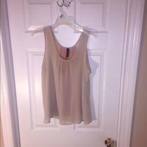 Somewhat sheer tank top blouse. The coral on the back has two panels that hang off the shirt. It's really pretty on. Need a cami or bandeau underneath. Bought at a boutique. Worn 3 times.