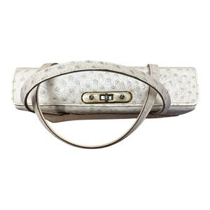 This cream tote bag features a distinctive textured pattern reminiscent of exotic leather, giving it a unique look. Its structured rectangular shape allows it to stand upright, while the medium-length handles provide versatility for carrying. Perfect for adding a stylish touch to your everyday ensemble.