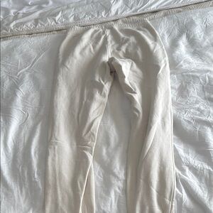These cream track pants offer a relaxed fit with a comfortable elastic waistband, perfect for lounging or light exercise. The tapered design towards the ankles adds a modern touch to these jogger-style pants. A bold black text or logo along one leg enhances the casual aesthetic.