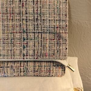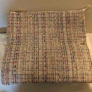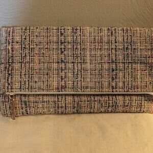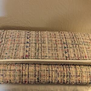 Cream Tweed Fold Over Bag. Gold Tone Hardware and Chain with White Satin Lining. Pre-owned, this bag is in great condition. Clean. It measures 11/5" W x 6.5" folded over and 11.5" x 11.25" when opened fully.