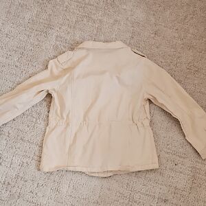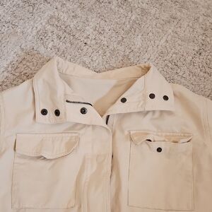 Stylish cream utility jacket with multiple pockets. Perfect for casual outings.