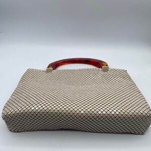 cream, metal mesh, tortoise handle, vintage accessory, retro bag, minimalist style, statement piece, old Hollywood, 1970s inspired, chic clutch