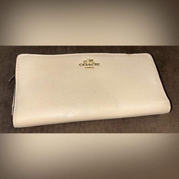 Stylish wallet in beige. Accented with a gold logo. Perfect to match with any outfit.
