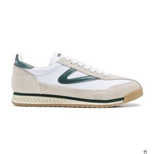 Retro-inspired Tretorn Rawlins sneakers featuring a cream and white upper with contrast green side logo. Designed with a low-top profile, lace-up closure, cushioned insole, and textured gum-style outsole. Mixed-material construction blends suede and mesh for breathable comfort and everyday wear.