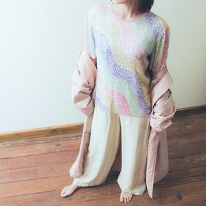 A luxe trouser in a delicate white and cream stripe. The wide-leg, high-waist cut is flowy and flattering -- plus, she's a practical queen with two generous pockets!