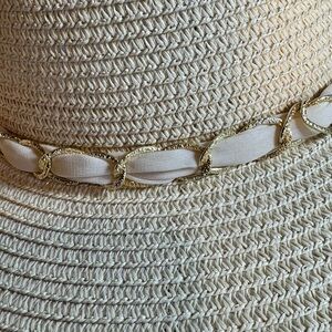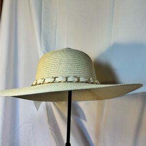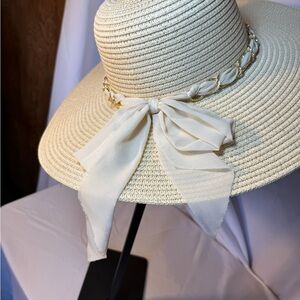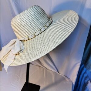 Stay stylish while protecting yourself from the sun with this elegant cream wide-brim hat. Features a braided chain detail with a flowy ribbon bow accent, making it a chic accessory for beach days, garden parties, or summer outfits.