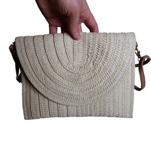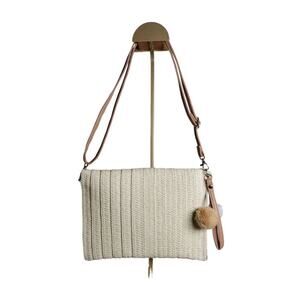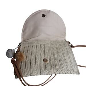 Cream Woven Straw Envelope Bag Crossbody or Clutch with Embroidery & Pom Pom