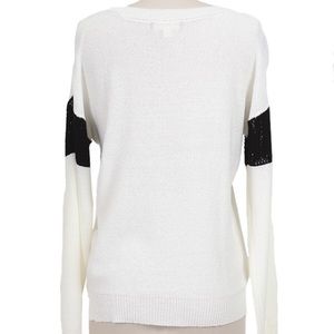 Light weight sweater cream color with black accents on cross and sleeve. Mesh material great for Fall or Spring.