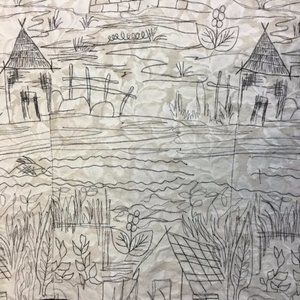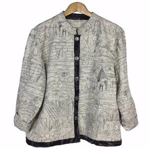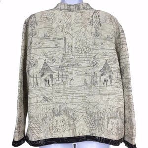 Jacket made from cream and light tan textured leaf print fabric with black embroidery of tropical huts, stone arches, and flowers. Black trim down the front, along the bottom and the cuffs. No tags but possibly Chico’s. No visible flaws. All measurements are taken flat and are approximate.