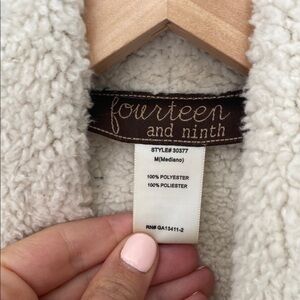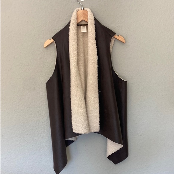 This elegant vest showcases a chic two-tone look with a black exterior and a plush cream interior. The waterfall collar creates a graceful, flowing silhouette, perfect for layering. Made from soft materials, it combines comfort with a touch of sophistication.