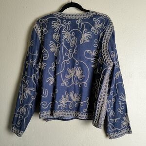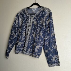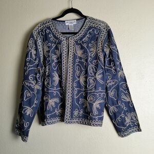 Cream and Blue Floral Jean Jacket with Textured Design Silk And Cotton Size XL