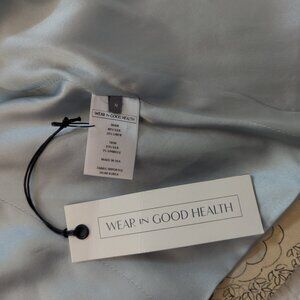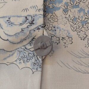Gorgeous rich cream and blue jacket by Wear in Good Health. Silk and linen, with a subtle yet striking fabric and a beautiful robin's egg blue lining. Vented back, piping at shoulder seams, dramatic split sleeves, and a fabric-covered button with knot detail. Made in USA, tag still attached.