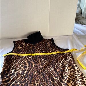 This elegant sheath mini dress features a sophisticated mock neck and sleeveless design, perfect for a night out. The cream and brown animal print creates a striking ombré effect, adding depth and allure to the dress. The mock neck is accentuated with delicate black lace, enhancing its chic appeal.