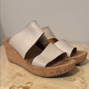 These stylish cream and brown wedge sandals feature wide textured straps for a comfortable fit. The medium-height wedge heel offers a natural lift, making them perfect for casual outings. Crafted with a cork-like sole, they provide both elegance and ease for everyday wear.