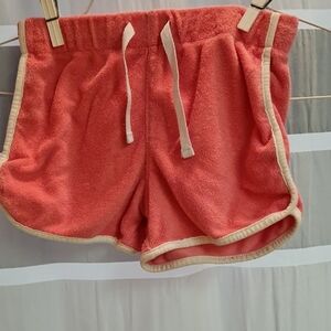 Adorable cream top with colorful heart pattern. Soft pink shorts with drawstring. Perfect for playtime.
