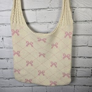 This shoulder bag features a charming cream base adorned with a delicate pattern of pink bows, offering a touch of elegance to any ensemble. Its soft color palette and dainty design make it a versatile accessory for various occasions. The bag's structured form and comfortable straps ensure both style and functionality. measures 15in wide, 14in deep