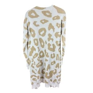 This cozy cardigan sweater features a bold animal print in cream and tan tones, offering a stylish and comfortable layering option. Its open front design and long length make it perfect for adding a touch of elegance to any outfit. Crafted from soft knit fabric, it ensures warmth and style throughout the season.