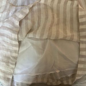 Cream/tan and white linen skirt! Buttons up the front and ties to create a flattering waist. The skirt is lined and is long enough on for work.