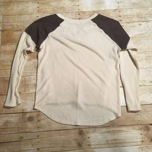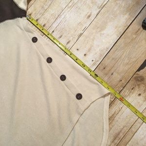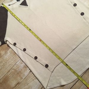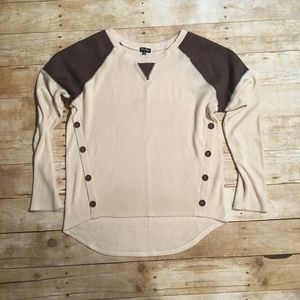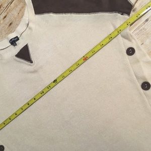 Never worn. Brown suede-like patches on shoulders and elbows. Shirt is on the thinner side. Accent buttons in both sides.