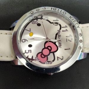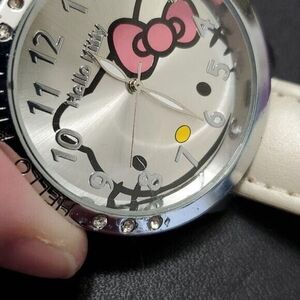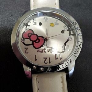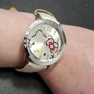 Adorable silver colored watch features Hello Kitty on the face with a pink bow. The watch strap is a cream color. See photos for condition. Needs a new battery.