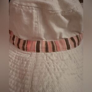 Cream cotton bucket sun hat with pink/brown striped ribbon around the base of the hat. Great sun protection.Excellent condition with no rips stains or tears.
