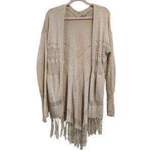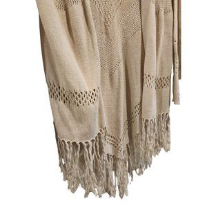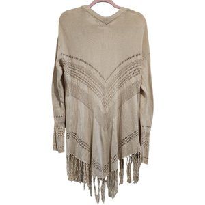 Description: Open knit detail with fringe tassels on the bottom, slight hi-low style, long sleeves
