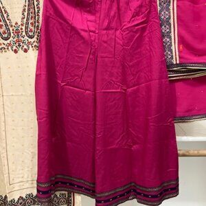 Simple elegant-looking palazzo suit with gorgeous pink palazzo. It is medium in size. The dupatta had embroidered borders.