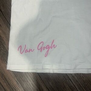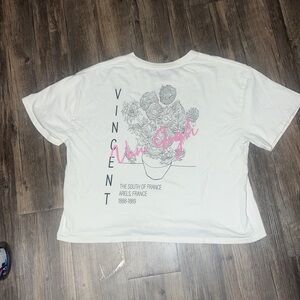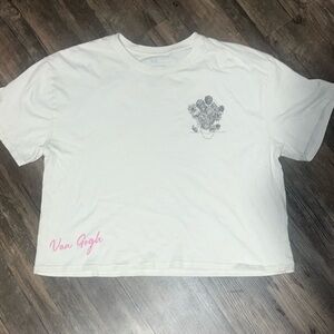 White t-shirt featuring a Van Gogh graphic. Simple and artistic design.