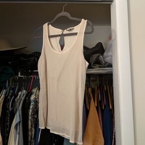 Gently worn shell with plenty of life left in it. Works great on it's own as a tank top or under a sweater. It is layered and I never wore a tank top under it (a nude bra didn't ever show when I wore it). Excellent under a suit or blazer. True to size. There is a very slight snag (included an up close picture) but you have to be looking for it.