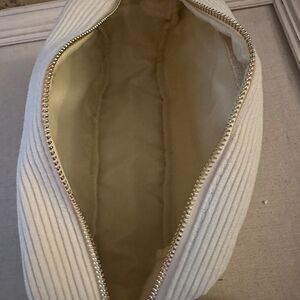 Cream wide wale corduroy travel makeup cosmetic pouch clutch with gold hardware. There is a pink fuzzy heart patch with a gold glitter border. Nylon interior. Easy to clean.NWOT