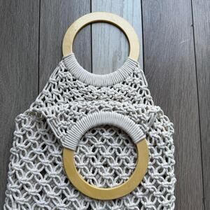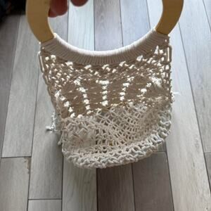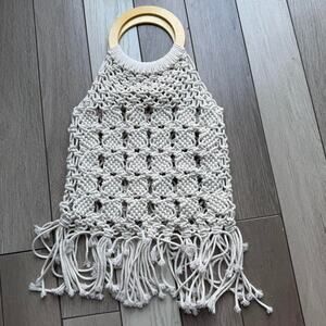cream crochet, wooden handle, boho style, fringe embellishment, neutral tones, handcrafted, summer accessory, textured weave, rustic charm, beach bag