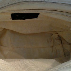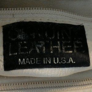 Cream cross body leather purse with zippered pocket and gold decoration. 1 large zippered pocket with a smaller zippered pocket inside. Made in U.S.A. Approximate measurements: 10.25" wide, 7.25" tall; 4" bottom. No tags anywhere to show manufacturer. Interior label shows wear but otherwise this purse is in great condition.