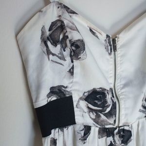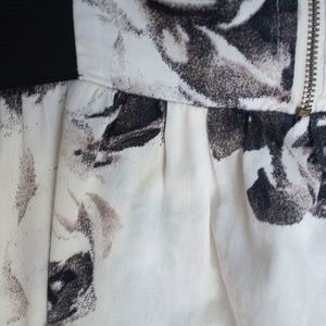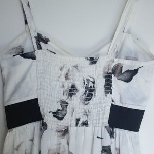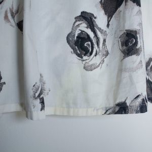 Cream-colored dress with black ink/watercolor style rose print and black elastic waist detail. Functional front zipper adds a flirty touch. Smocked elastic back panel for a perfect fit.