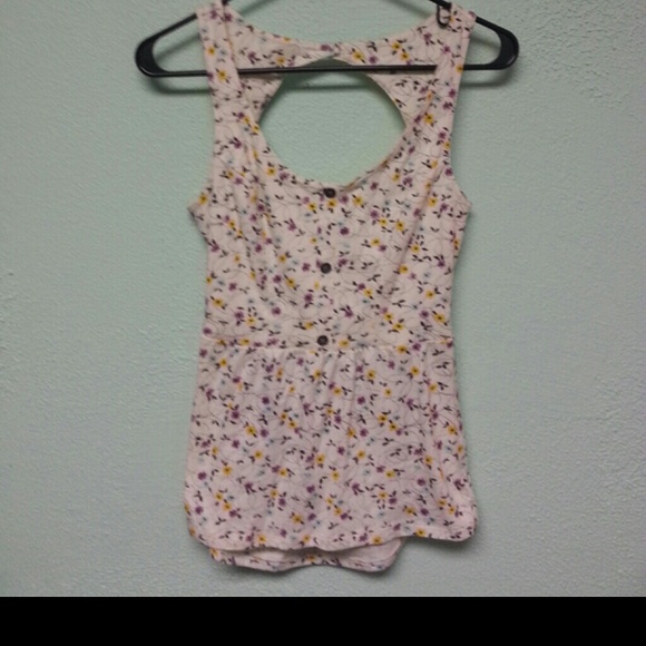 Cream colored floral backless tank with blue yellow and purple flowers with thre bronze buttons up the front such a cute summer shirt the back is what makes this tank super different