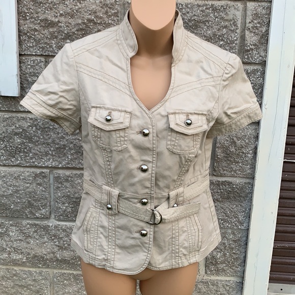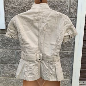 Cream colored jacket with silver buttons and a little belt. From a smoke/pet free home.