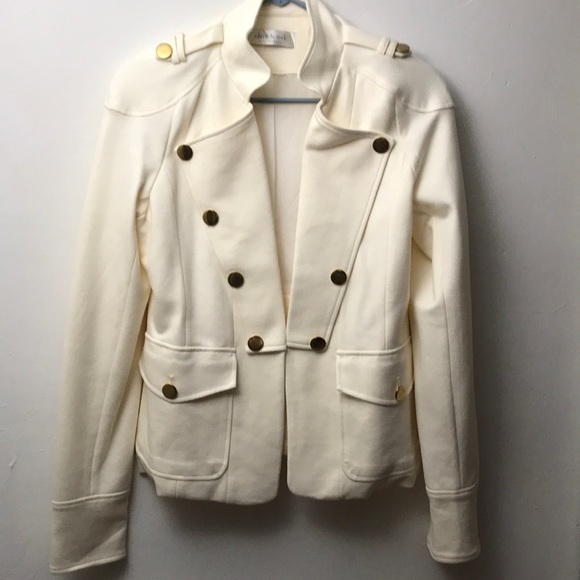 A cream jacket with gold buttons. Never worn, and brand new. With hooks on the inside to keep it closed.