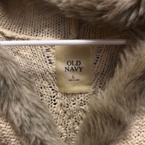 Super cute cream sweater vest with tan faux fur lining. Fits like a crop top. 2 button closure in from, detailed knit down the back! Old Navy size L.