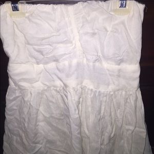 Strapless mini dress. Looks white but is actually a light cream color! It is very cute but just wrinkles easily! Ties in a bow in the back with a large cutout. Never worn before! Bought it but it is a little short on me. I am 5 foot 3 so it would fit someone a little shorter better!