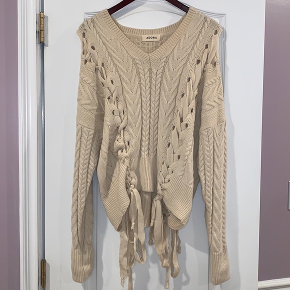 Oversized fashionable cream colored sweater with a gorgeous pattern and ties along the bottom.