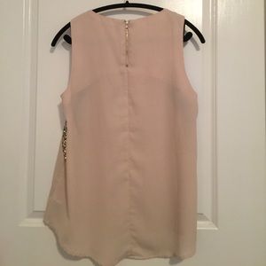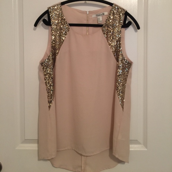 Dressy cream tank with gold sequence on the sides. Very comfortable and flattering. A few small stains but not noticeable.