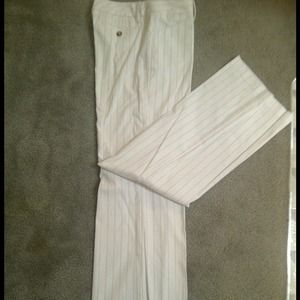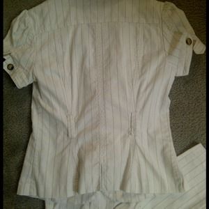 Short sleeve with button closure at sleeves and front. 97% cotton 3% spandex. Top size L. Pants size 9, 32 in inseam. Really cute work outfit!