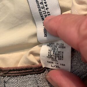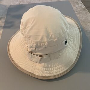 100% nylon bucket hat. Cream color with tan trim. Velcro adjustable tan on back. Venting on sides.