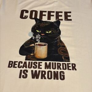 Cream t-shirt featuring a humorous coffee cat graphic. Perfect for casual wear.